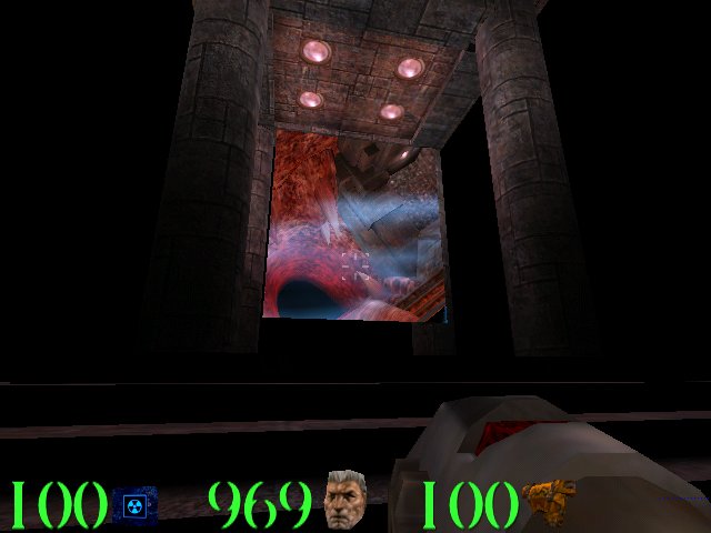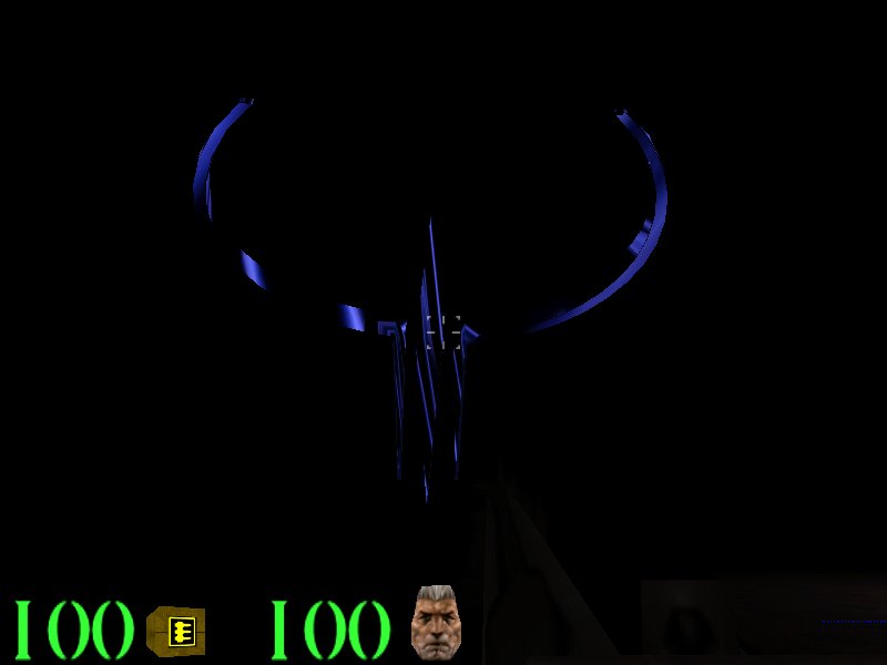 Enfin, grâce à cette démo destinée au fabriquant hardware, on peut se rendre compte du moteur de Q3, avec ses nouveaux effets et ses nouvelles armes. Après le lancement de l'exécutable, un menu apparaît à l'écran, menu type "Unreal" affichant le chargement des différents drivers et bibliothèque. Là, apparaît la console habituelle. Je ne peux pas aller dans une zone de jeu car les maps ne sont pas encore définies. De ce fait, je lance la commande "map km_portal" pour accéder aux maps présentes sur le "zip"! Quelques secondes plus tard me voilà dans l'univers de Q3 !!! :) Comme vous pouvez le voir ci-dessous, ça commence par une pièce très sombre dans laquelle plane le logo de Q3 translucide, balayé par une lumière bleue qui met en évidence les effets de transparence. Au milieu de la pièce se tient un portail ( que j'ai cru être un téléporteur au début!), dans lequel on peut voir une porte avec l'image en rotation du monde vers lequel je vais me diriger, ça c'est nouveau! Sur l'interface, peu de changement, si ce n'est la présence de pictogrammes à l'effigie des munitions utilisées, du joueur, et de l'armure, pictogrammes en mouvement 3D d'ailleurs. Deux armes sont alors disponibles dès le début, "une tronçonneuse et un machine gun". Noter que les effets de tir du machine gun sont jolis. De plus, c'est très fluide, ma config: céleron 333 + voodoo2 en 800*600 !!. Testé en 1024, c'est toujours fluide, là gros progrès. Rapidement, je configure mes commandes, pas de problème rencontré, go !, je passe la porte...... |