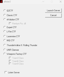 Allstar CTF prend en charge 10 types de CTF différents, et exécuter un serveur avec chacun d'eux est très simple. Dans le répertoire Quake2/ctf/, vous trouverez un programme appelé Allstar2.exe. Lorsque vous exécutez ce programme, vous pouvez sélectionner la version de CTF que vous souhaitez exécuter. Vous pouvez également exécuter le serveur en tant que serveur dédié ou serveur d'écoute. Faites votre choix et cliquez sur « Lancer le serveur » pour démarrer le serveur.